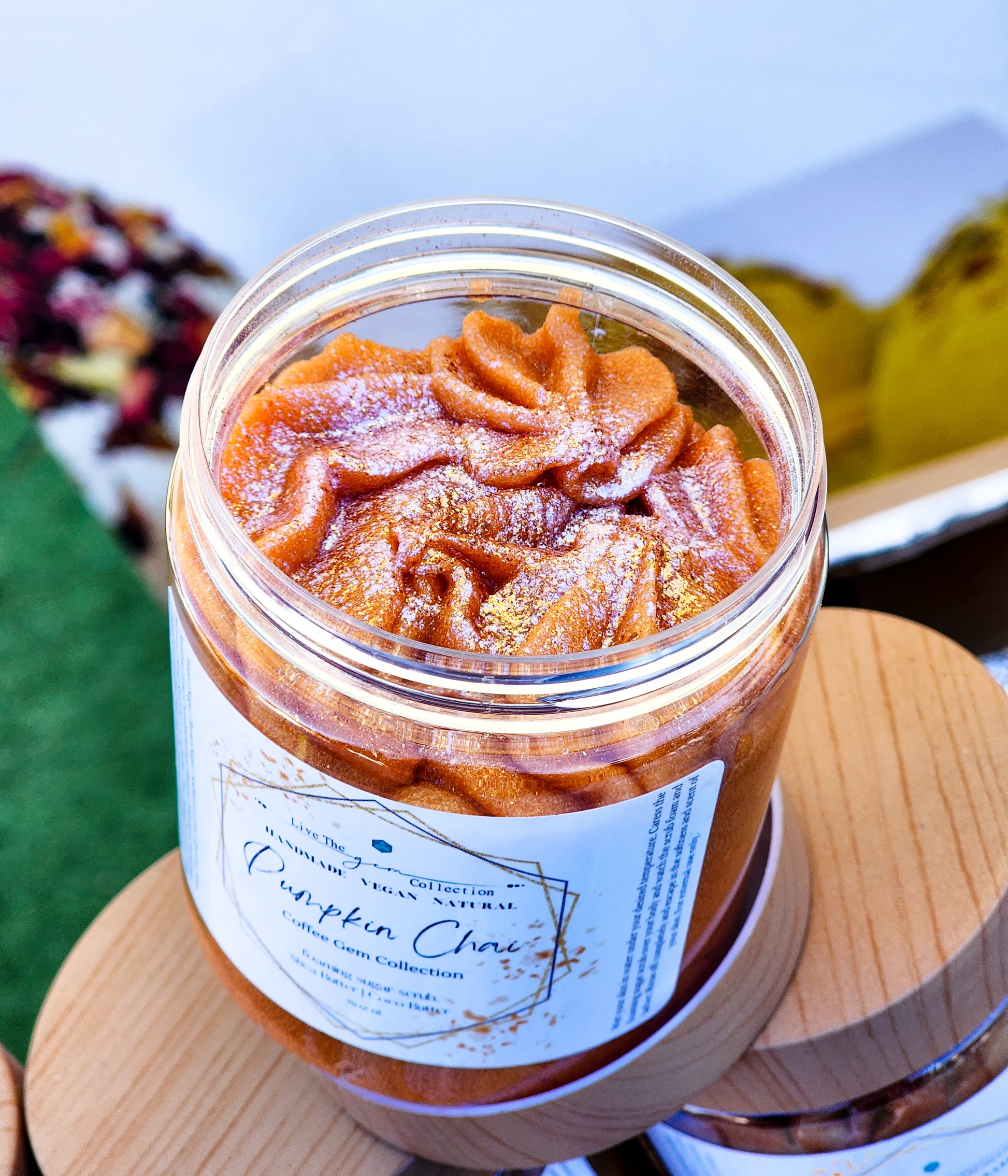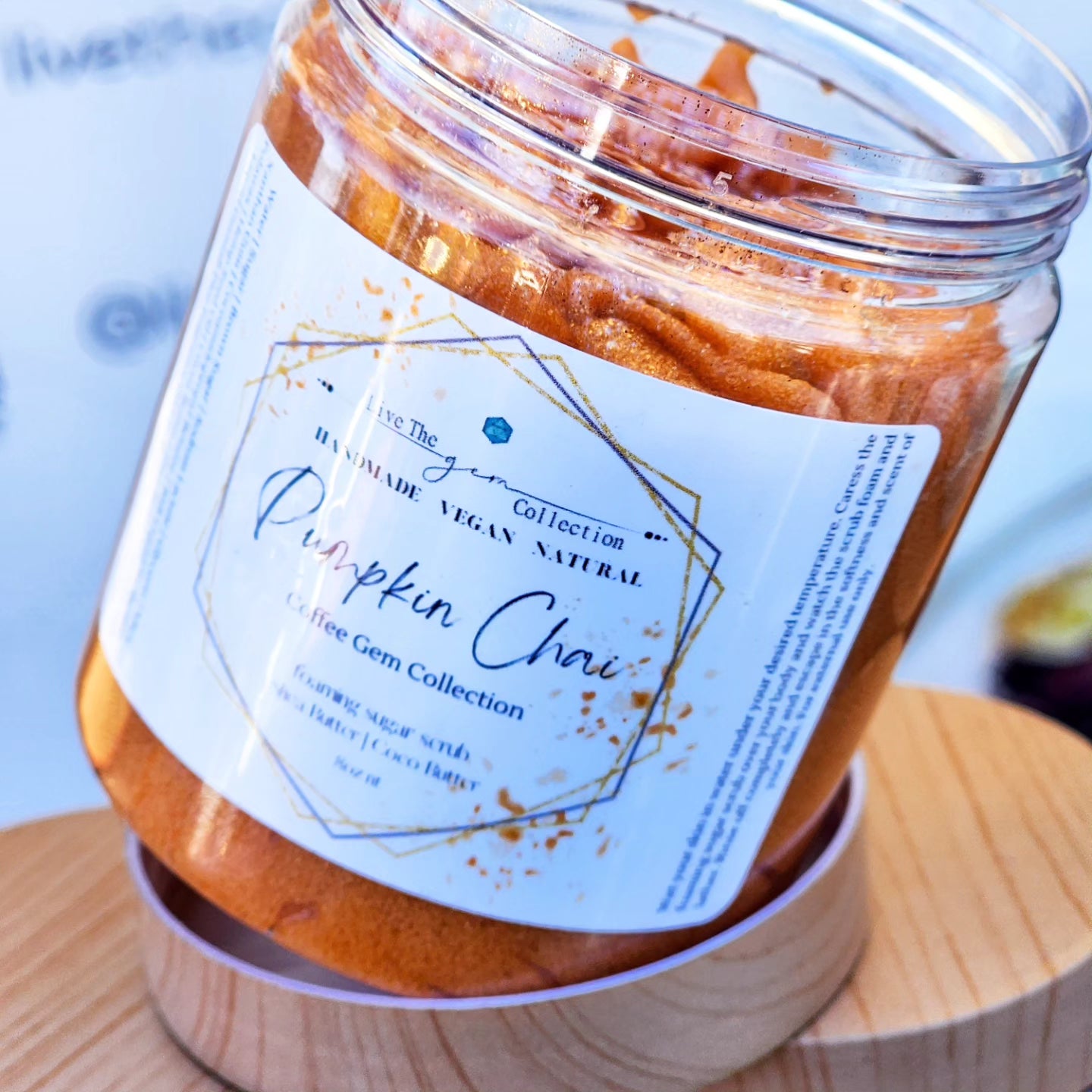 Unveiling the essence of autumn in our Pumpkin Chai Foaming Sugar Scrub, apart of our newest GEM Coffee Collection. Inspired by the comforting blend of pumpkin, cinnamon, black chai, and warm coconut milk, this luxurious scrub is your ticket to a cozy skincare experience.
